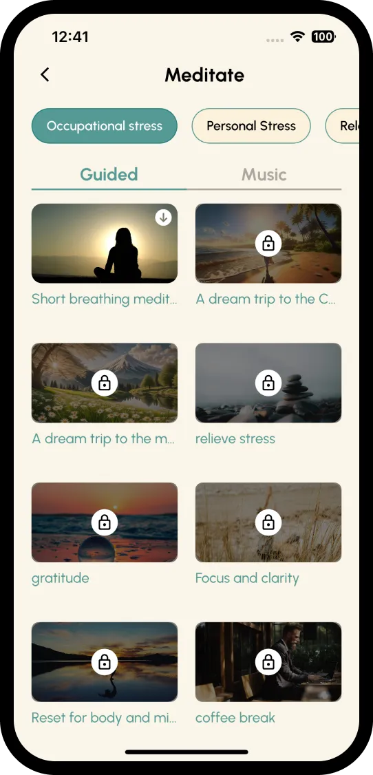 - Therapist-Created Video Library: 5–10 min videos for anxiety, stress, insomnia, and emotional regulation, based on CBT & mindfulness techniques