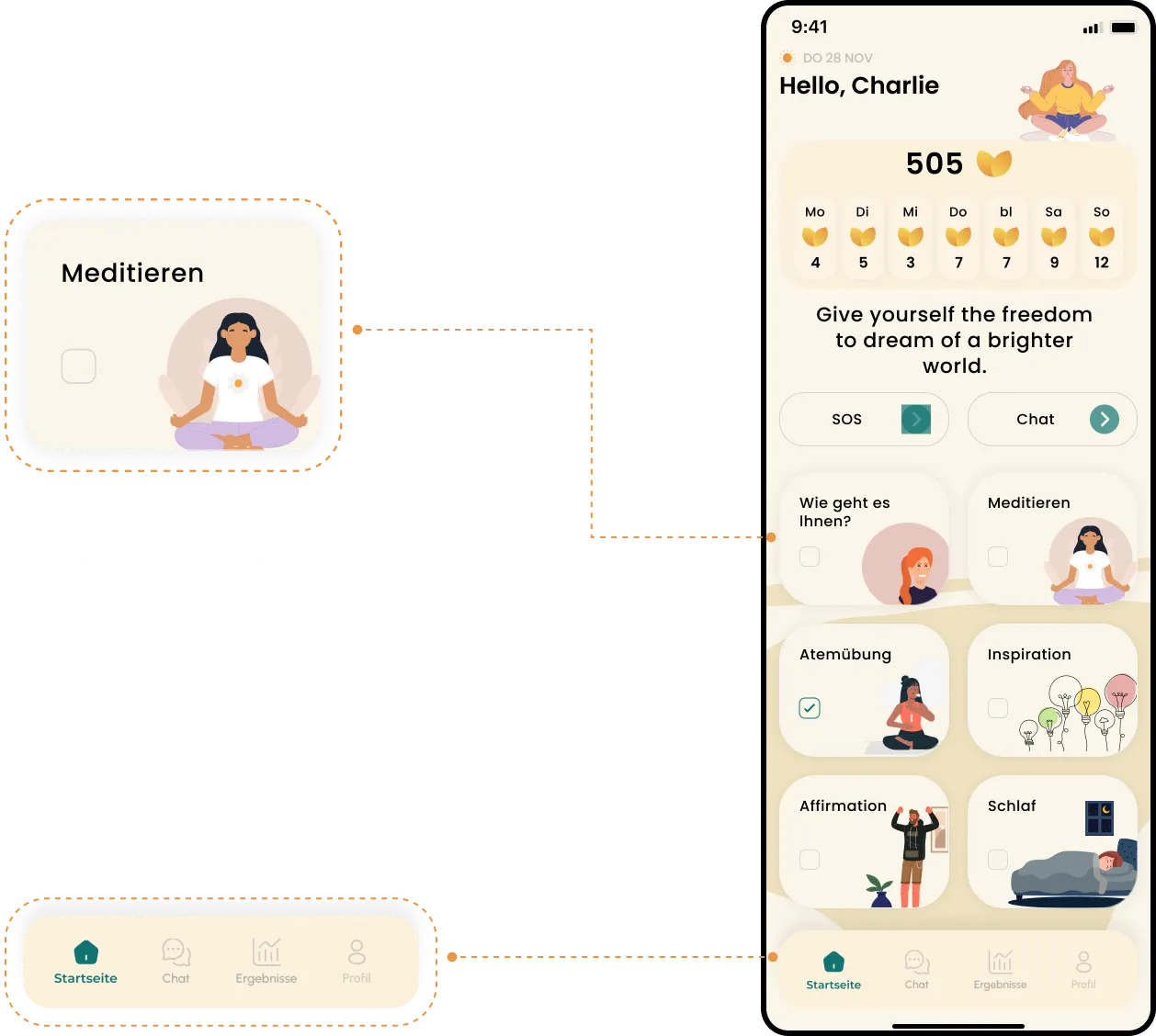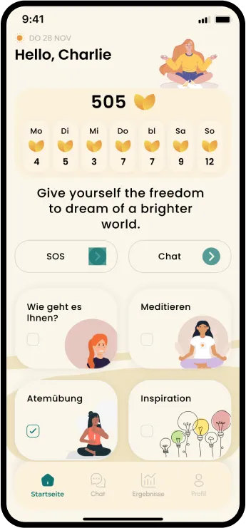“Meditieren brings peace to your daily life with guided meditation sessions and mindfulness exercises. Track your breathing, relax with calming visuals, and reduce stress in just a few minutes each day.