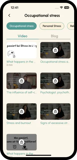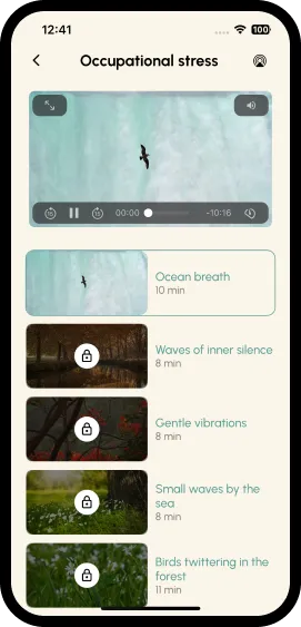- Therapist-Created Video Library: 5–10 min videos for anxiety, stress, insomnia, and emotional regulation, based on CBT & mindfulness techniques